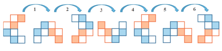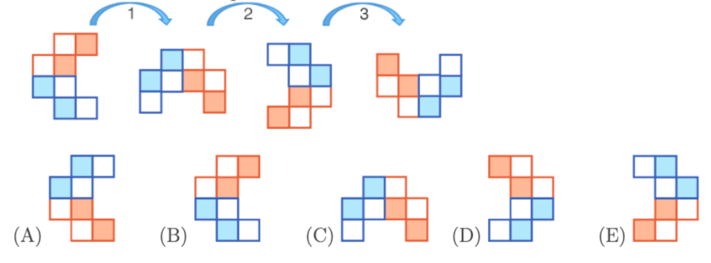 After 4 turns, the shape returns to its original position. So, 6 turns is the same as doing 2 extra turns beyond a full cycle. Look at how the shape looks after 2 turns — that's the final answer E.