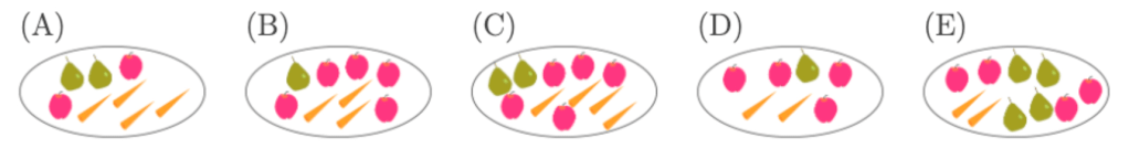 In which picture are there twice as many apples as carrots and twice as many carrots as pears?