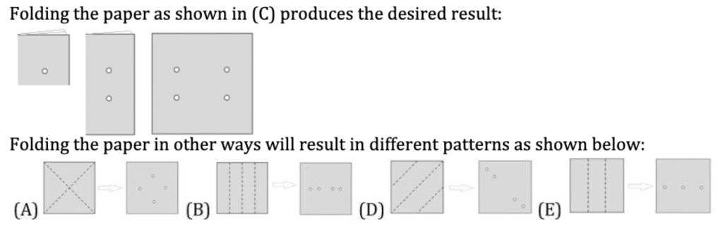 Option C folds the paper into quarters, so one hole in the folded paper becomes four holes when unfolded. The positions match the final image.