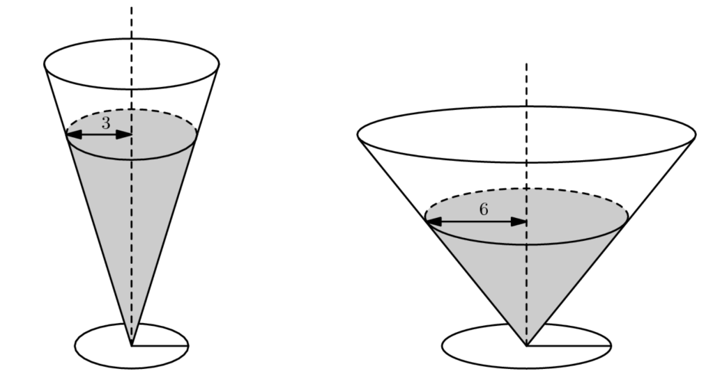 The ratio of rises is \(\frac{h_1}{h_2}=\frac{r_2^2}{r_1^2}=\frac{6^2}{3^2}=\frac{36}{9}=4.\)