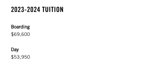 | Tuition (boarding) | ~$67,000/year | ~$70,000/year |