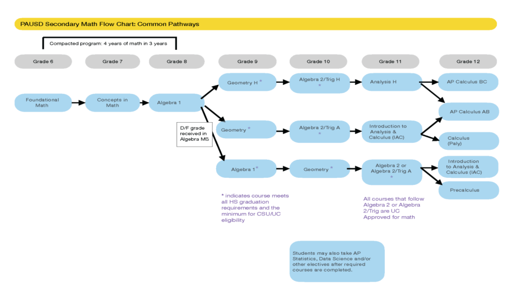 Palo Alto Unified School District (PAUSD) is a strong example. Below are two math pathway charts that illustrate how the district supports both standard and advanced learners: