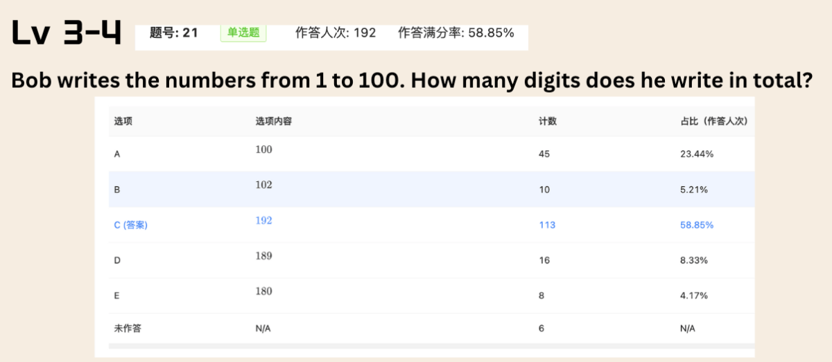 Similarly, in Levels 3- 4, children often rush through questions. In this question, 23.44% of children hastily choose 100 as the answer, failing to recognize its complexity as the 21st question, worth four points. To solve it accurately, students must categorize each digit by considering one-digit, two-digit, and three-digit numbers.