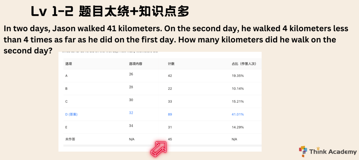 In Levels 1-2, the difficulty arises mainly from a lack of comprehension. However, in Levels 3-4, it’s more about the complexity of the problems, which require navigating through numerous steps. it’s more like these problems have too many hoops to jump through. So, students can’t devote the full attention needed to each step. Take this one, for example:
