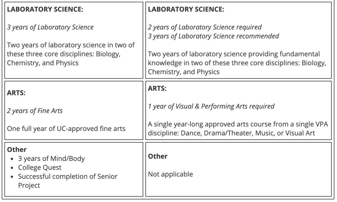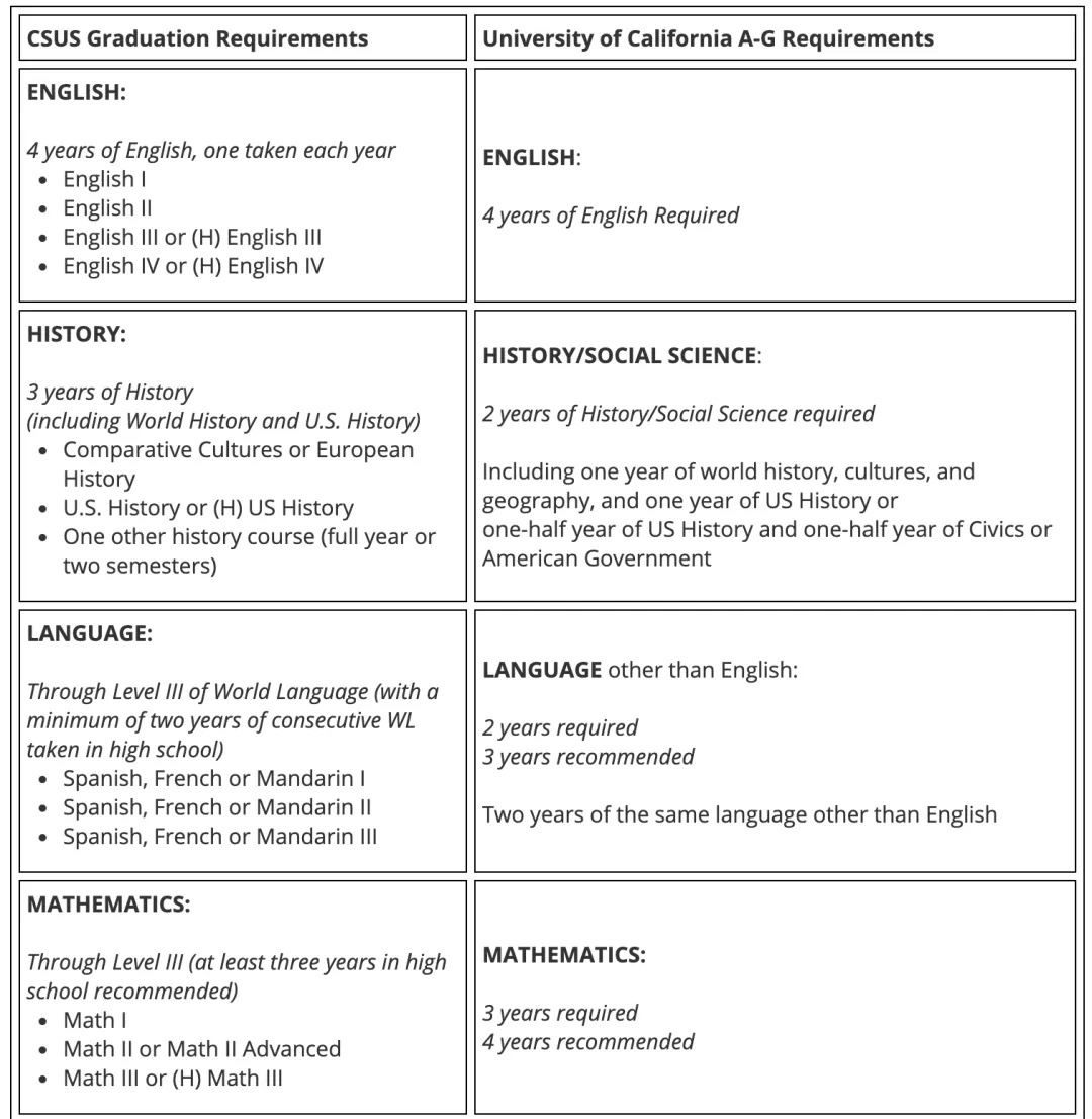 The graduation requirements of CSUS far exceeds the admission requirements of the University of California A-G sections. Students also need to complete the learning requirements of various subjects with different grades.