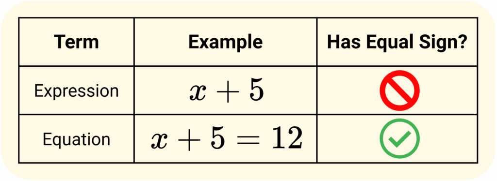 An expression includes constants (numbers), variables (letters that stand for unknown values), and operations like addition, subtraction, multiplication, or division. It does not have an equal sign.