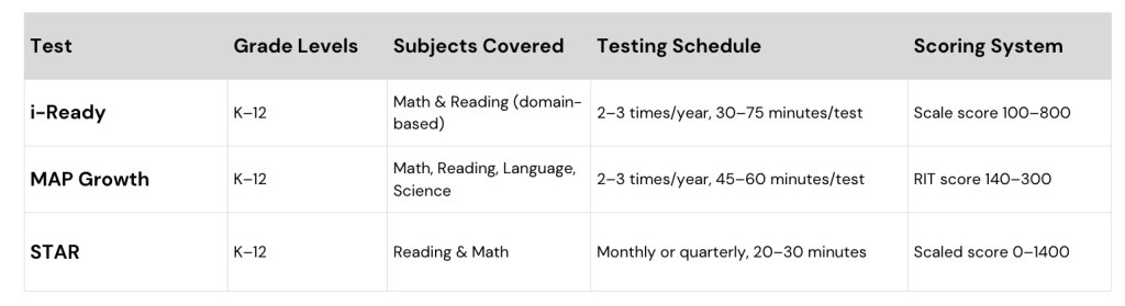 While i-Ready, MAP Growth, and STAR Renaissance all measure student progress, they serve different purposes. i-Ready blends diagnostics with instruction, MAP Growth provides national benchmarking, and STAR offers frequent monitoring.