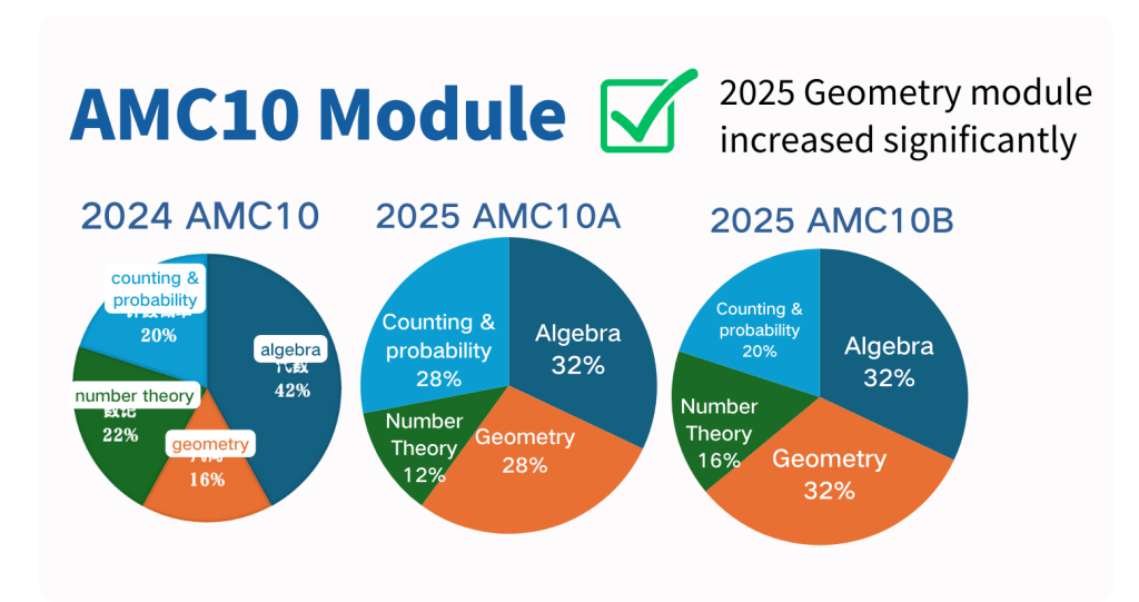 For students aiming to compete in math competitions like the AMC 10/12, geometry takes on an even greater importance. In these competitions, geometry accounts for around 30–35% of all questions. However, these problems are not simple textbook exercises. They require: