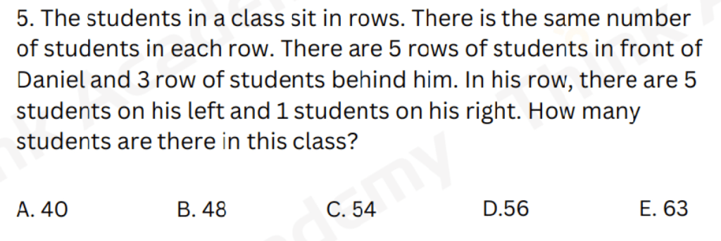 - The “Invisible Me” Error (Off-by-one): Most students simply add the numbers they see in the text: 5+3=8 rows, and 5+1=6 students. Then they calculate 8×6=48 (Choice B). They forget to include Daniel himself in the count.