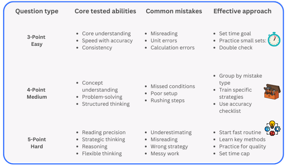 In the final stretch, every student should work on both 4-point and 5-point questions—the difference is how much time to spend on each, and what the goal is. 3-point questions build the base, but most score growth comes from fixing 4-point accuracy and learning how to approach 5-point questions without getting stuck.