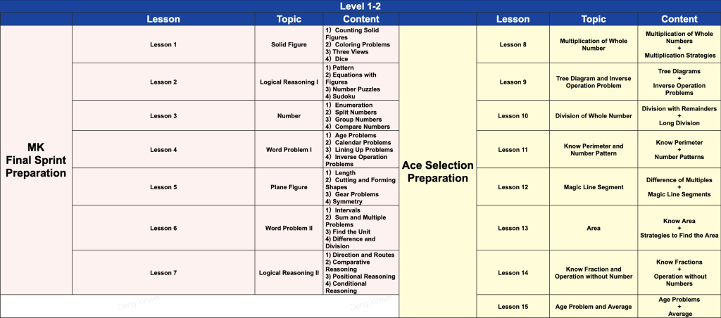 - [Lesson 8-15]: For families looking beyond MK… a pathway into Think Competition ACE Track! Lesson 8-15 will be focusing on the essential concepts taught throughout this year’s ACE curriculum, preparing students for the Think Competition ACE Selection.