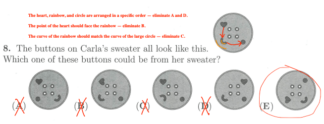 - Solution: To solve this pattern matching problem, carefully observe the spatial relationships among the four decorations in the reference pattern. For example, the heart and the circle are separated by four small circles, with the pointed end of the heart facing the arch shape. Additionally, the opening of the arch faces toward the four small circles. Only option E correctly maintains all these spatial relationships, making option E the correct answer.