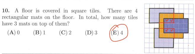 - Solution: To solve this spatial reasoning problem, carefully examine how each rectangular mat overlaps the others. A tile must be covered exactly three times, meaning three mats must overlap at that point. By checking the central overlapping area closely, we can identify that there are exactly 4 tiles meeting this condition. Thus, the correct answer is (E) 4.