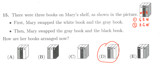 - Solution: Start with the order White–Black–Gray. First, swapping the white and gray books gives Gray–Black–White. Then, swapping the gray and black books results in the final order: Black–Gray–White. Thus, the correct answer is (D). Drawing a step-by-step diagram can help students clearly visualize and understand this solution.