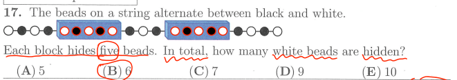 - Solution: This is an alternating pattern problem. Each block hides exactly five beads. To solve, carefully observe the visible beads to determine the hidden pattern: black and white beads alternate consistently. Maintaining this alternating logic, we can deduce the hidden beads’ colors by counting from the visible beads at both ends of each hidden section. Each hidden section contains exactly 3 white beads, resulting in 6 white beads hidden in total. Thus, the correct answer is (B) 6.