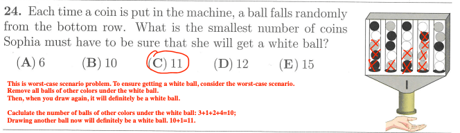 - Solution: This Math Kangaroo problem tests logical reasoning and understanding of the worst-case scenario—the unluckiest possible outcome. To guarantee that Sophia receives a white ball, we assume every non-white ball drops first. By carefully counting non-white balls beneath each white ball, we have: Column 1-3 black and gray balls, Column 2-1 gray ball, Column 3-2 black and gray balls, Column 4-4 black and gray balls. Thus, the total non-white balls that can fall initially is 3 + 1 + 2 + 4 = 10. After these 10 balls, the next ball—the 11th ball—must be white. Hence, Sophia needs at least 11 coins to guarantee getting a white ball.