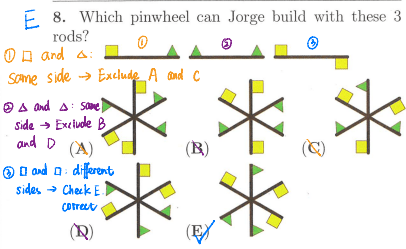 - Rod ③ has a triangle and square on opposite sides → only E matches this combination correctly. Thus, only option E can be built using the three rods provided.