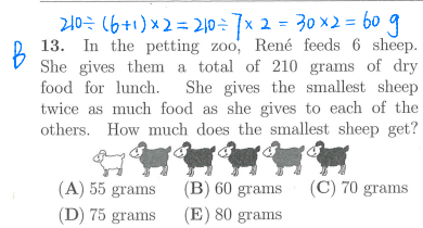 - Solution: There are 6 sheep. The smallest sheep eats twice as much as each of the other 5. That means the total food is split into 7 equal parts (5 sheep × 1 part + 1 sheep × 2 parts). So, 210 ÷ 7 = 30 grams per part. The smallest sheep gets 2 parts: 30 × 2 = 60 grams. Therefore the answer is B.