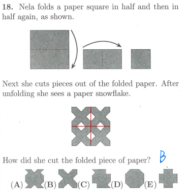 - Solution: This paper-folding and spatial visualization problem requires students to mentally reconstruct the unfolding process and identify symmetrical patterns. A helpful strategy is to use auxiliary lines—such as the two crossing red lines shown in the picture—to clearly visualize the symmetrical quadrants created by folding. Recognizing these symmetries helps students accurately reverse-engineer the cutting process. By applying this method carefully, it becomes clear that option (B) correctly shows the folded paper’s cut shape, maintaining the required symmetry and matching the final unfolded snowflake exactly.