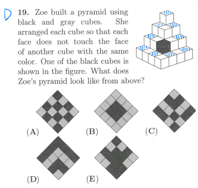 - Solution: This geometry and spatial reasoning problem asks students to visualize the pyramid from above while carefully following an important color-placement rule: no two cubes of the same color may touch face-to-face (meaning cubes can’t directly share a flat side if they have the same color; corners or edges touching is allowed). In the given figure, one black cube is explicitly indicated. Therefore, any cube that directly touches this black cube face-to-face must be gray. Following this logic further outward, the next surrounding layer must alternate back to black cubes, making the cubes marked with blue lines black. Then carefully visualizing this color arrangement from above, the resulting pattern of black and gray cubes exactly matches option (D).