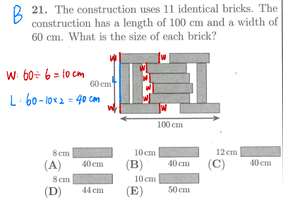 - Solution: This problem combines geometry, early algebra, and spatial reasoning skills. Students must carefully interpret the given dimensions (length: 100 cm; width: 60 cm) and determine the hidden dimensions of each brick. Vertically, the total width of 60 cm equals exactly 6 brick widths, thus each brick’s width is 60÷6=10 cm. Horizontally (along the left side), one brick length equals the total 60 cm minus two brick widths: 60−2×10=40 cm. Therefore, each brick measures 10 cm by 40 cm, making the correct answer (B).