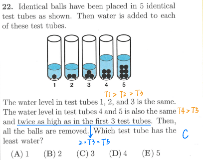 - Solution: This logic and proportional reasoning problem involves careful step-by-step comparison and elimination. First, compare tubes 1, 2, and 3: since tube 3 contains the most balls among these three tubes, it will have the least water remaining after the balls are removed. Next, compare tubes 4 and 5: tube 5 contains more balls, so it will have less water remaining than tube 4. Finally, compare tubes 3 and 5: tube 5 initially has twice the water volume of tube 3 and also has exactly twice as many balls as tube 3. Therefore, after removing all balls, tube 5’s remaining water volume will still be twice as much as that in tube 3. Thus, tube 3 ultimately has the least water, making the correct answer (C).
