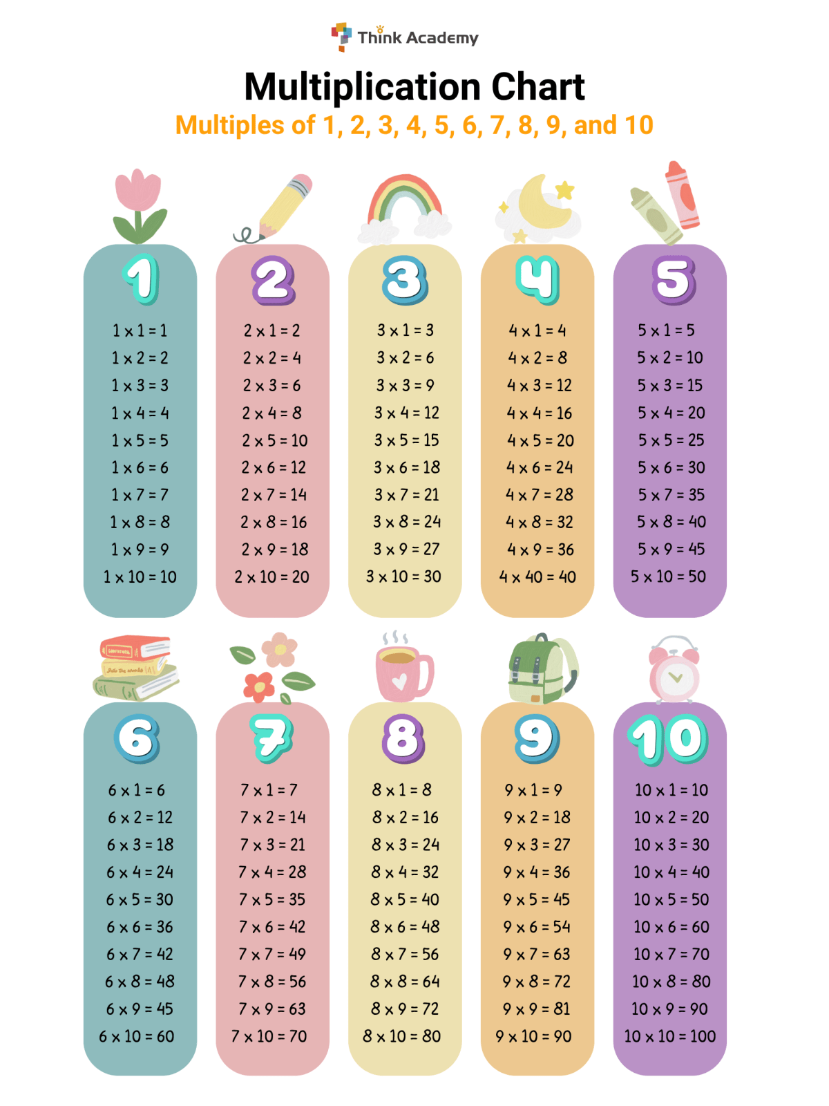 Multiplication is a key math milestone for elementary students, starting with simple 1-digit problems and progressing to multi-digit multiplication. In this guide, you'll find clear examples of both school math and math competition levels, printable multiplication charts (including 1–10, 1–12, and 1–20 tables), and strategies to help your child master multiples of 1 through 10. Whether you're reinforcing school math or exploring enrichment problems like Math Kangaroo, this resource combines visuals, logic, and practice tools for confident learning.