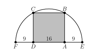 Rectangle ABCD is inscribed in a semicircle with diameter FE. Let DA = 16, and let FD = AE = 9. What is the area of rectangle ABCD?