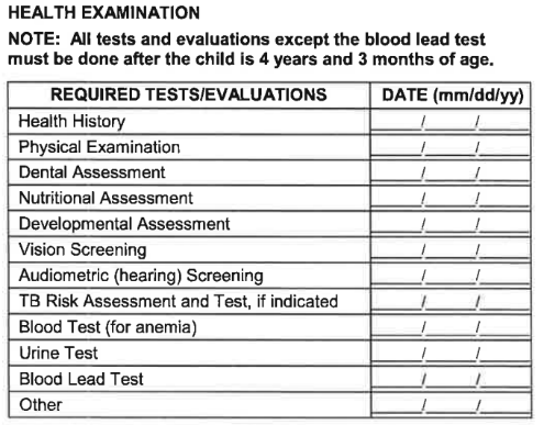 In addition, some school districts may require parents to submit their child’s recent medical examination results, mostly conducted within the past 12 months. Here is an example of the report of physical examination in the State of California.