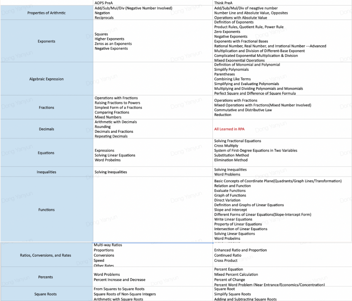 Think Academy Pre-Algebra course scope including exponents, expressions, systems of equations, functions, and proportions.