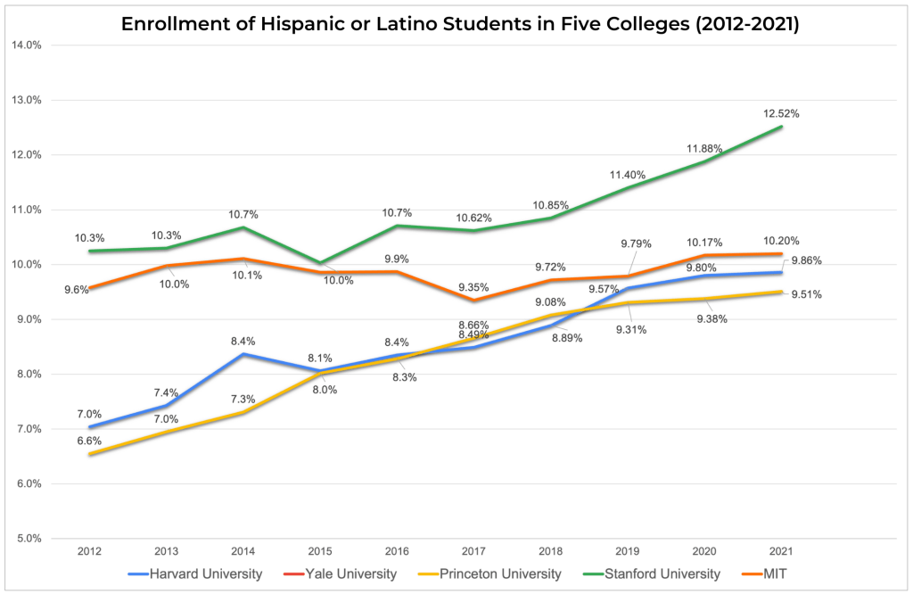 Enrollment of Hispanic or Latino Students in Five Colleges (2012-2021)