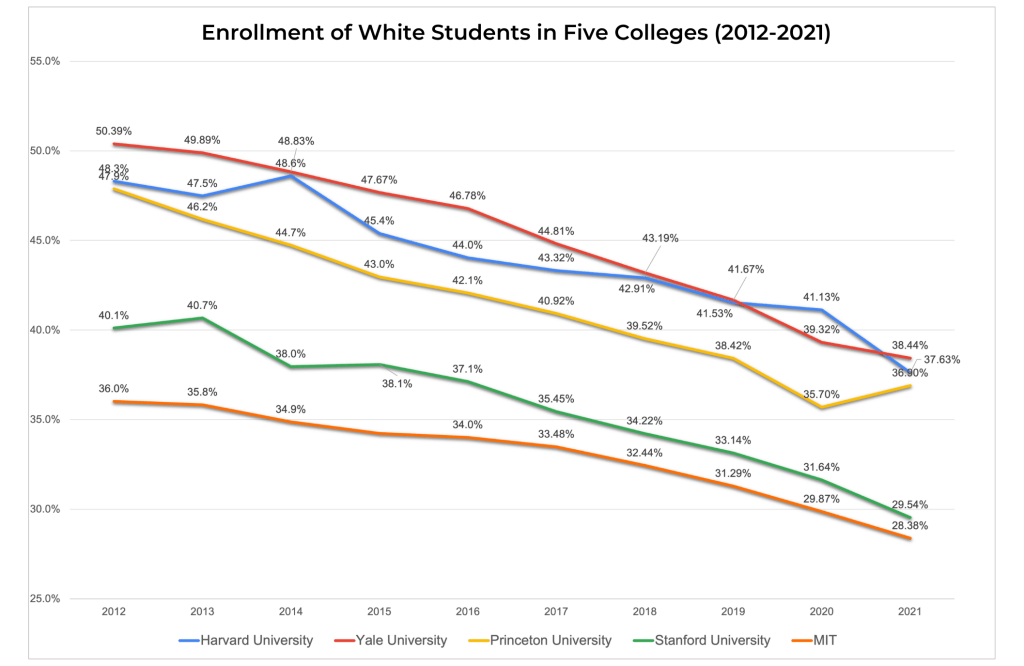 An analysis of enrollment data regarding students’ race and ethnicity at prestigious universities such as Harvard, Yale, Princeton, Stanford, and MIT reveals a noteworthy trend. Between 2012 and 2021, there was a consistent increase in the admission of Asian American, African American, and Hispanic students. Simultaneously, the enrollment of White students followed a declining trajectory over the same ten-year period.