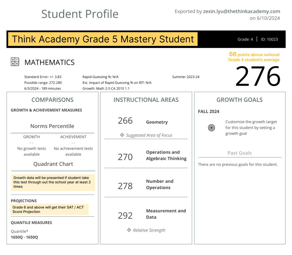 Additionally, students above Grade 6 receive SAT/ACT predictions based on their Math and Reading scores.